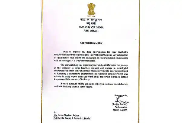 An appreciation letter by H.E.Sunjay Sudhir for the commitment towards sustainability on Women’s Day.