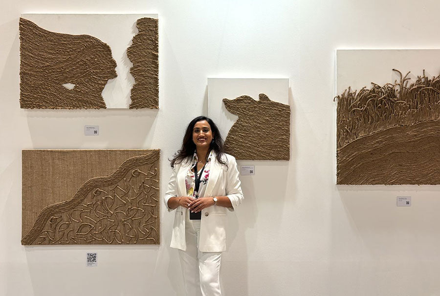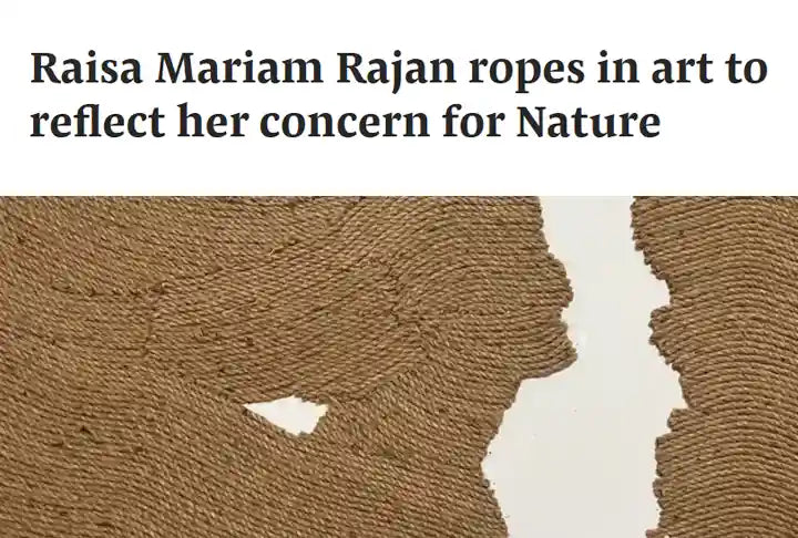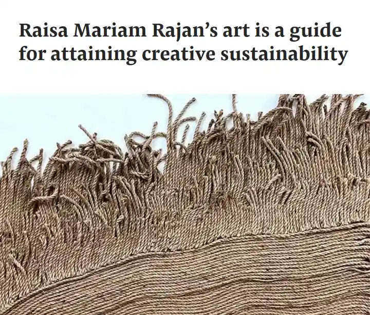 Weaving rope and thread into landscapes of memory and ecology, Raisa Mariam Rajan creates art that reimagines sustainability as both heritage and hope. Raisa Mariam Rajan’s practice emerges at the intersection of material, memory, and environmental consciousness. Working primarily with jute rope and zari, she redefines the language of sustainability through materials that are at once ecological and deeply cultural. Jute, a fibre rooted in durability and biodegradability, speaks to the earth’s resilience, while zari — the shimmering thread of South Asian textile tradition — carries the weight of craft, heritage, and ornamentation. Together, they form a dialogue between fragility and strength, tradition and transformation.