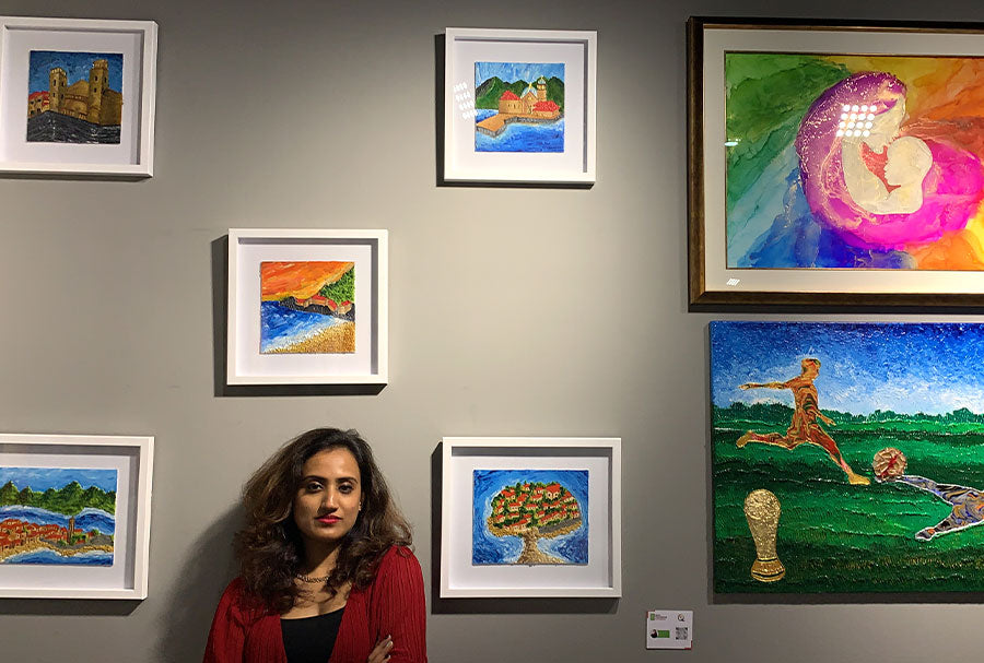Her sustainable artworks were exhibited in Qatar International Art Festival 2021. She walked the ramp to showcase nature art on fabrics by using natural materials.