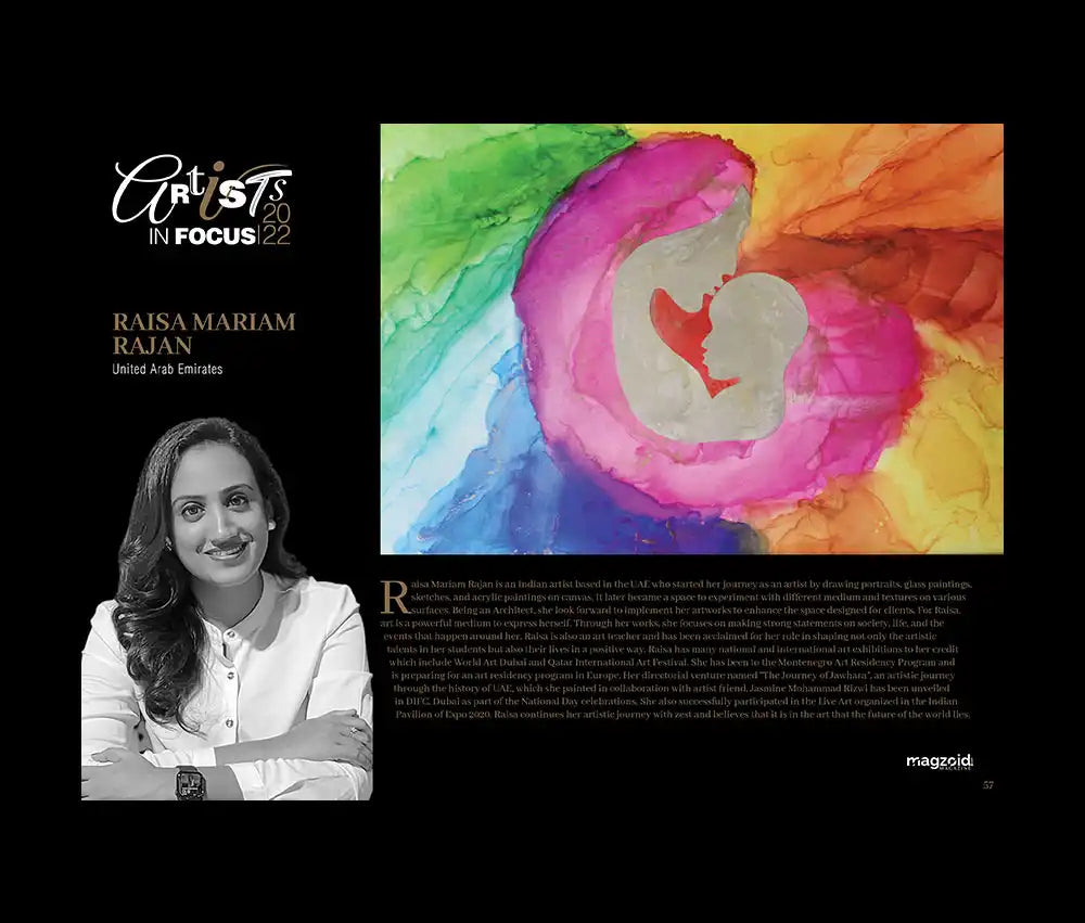 Raisa is selected to represent UAE’s Year of Sustainability 2023 along with her artwork named “REFLECTION” at Contemporary Art Cannes Biennale during the Cannes film festival 2023 as she is one of the first to advocate sustainability in the field of art and facilities management in UAE.